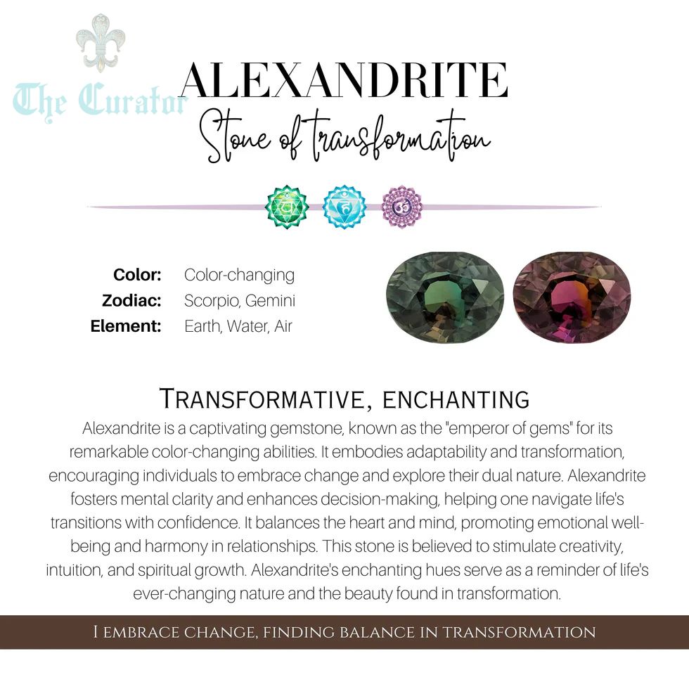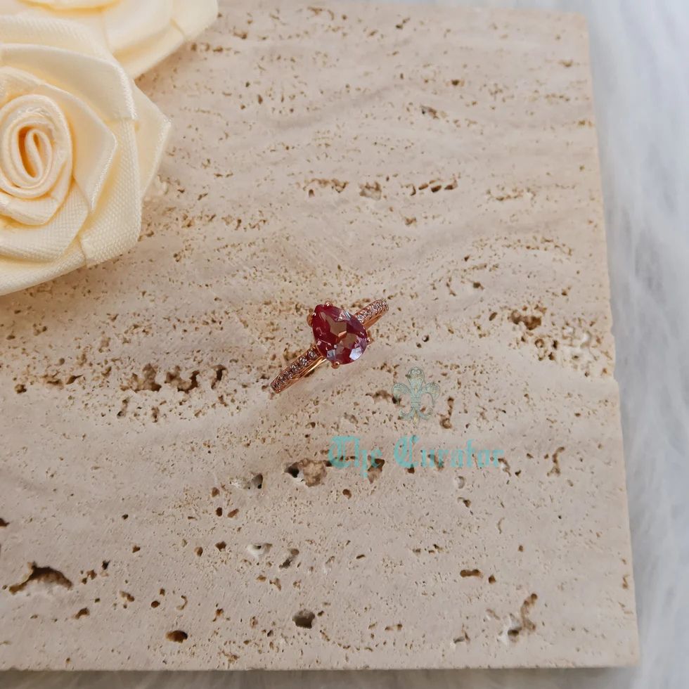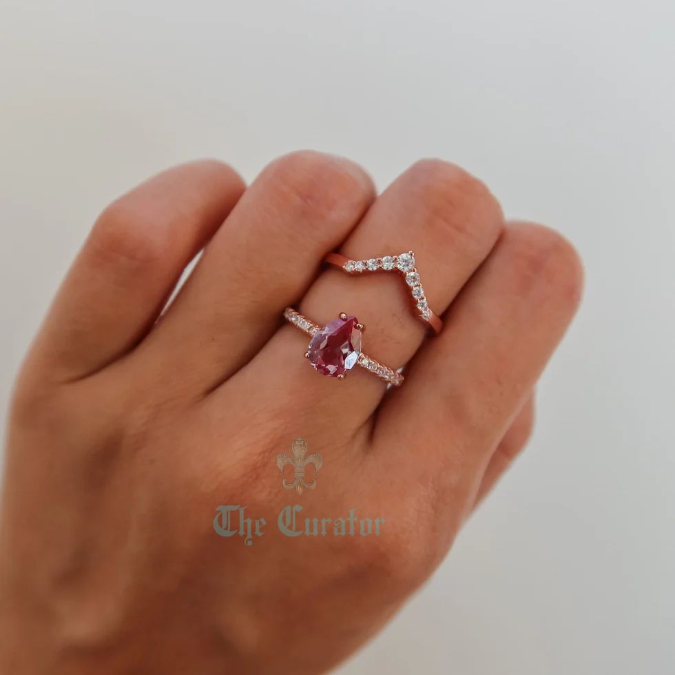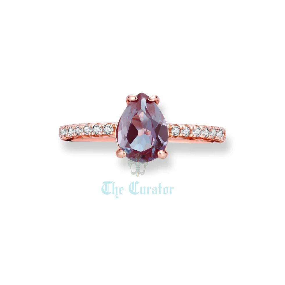 Meticulously designed with lab grown pear cut alexandrite and AAA Cubic Zirconia, this stackable ring set seamlessly combines everlasting grace with contemporary refinement. Alexandrite boasts a mesmerizing color-changing effect, ranging from green in daylight to purplish-red in incandescent light.