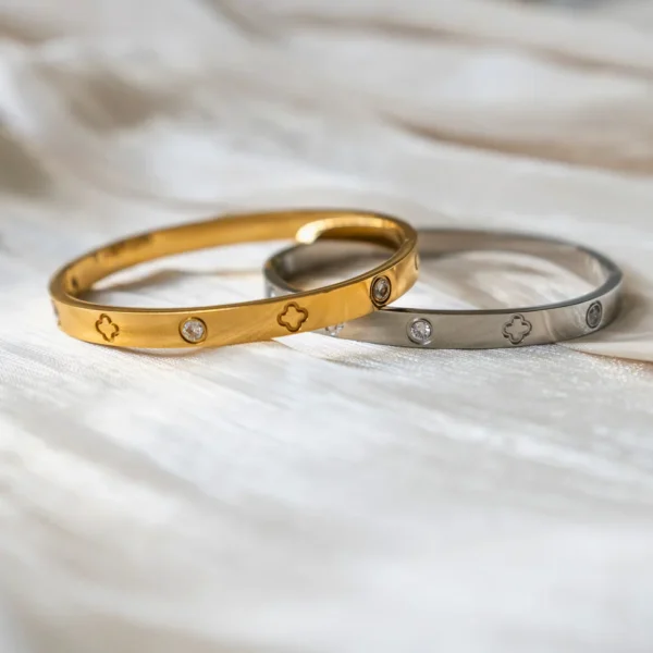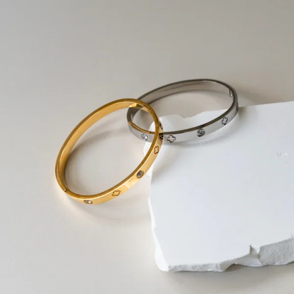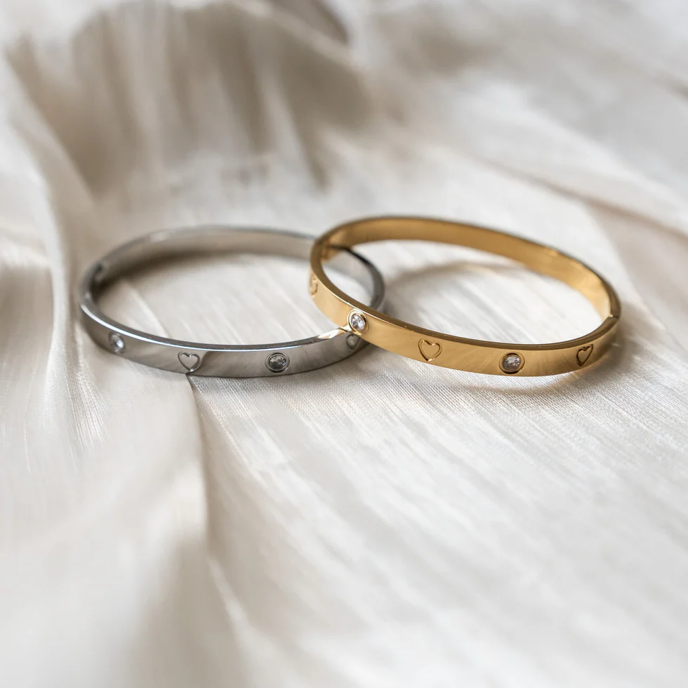This gorgeous JULIET bangle will add timeless charm to your look. Crafted from 316L Stainless Steel and paved with AAA cubic zirconia, the bangle is a durable and aesthetic piece that is guaranteed to be fade-free for life. Also available in 18K Gold.