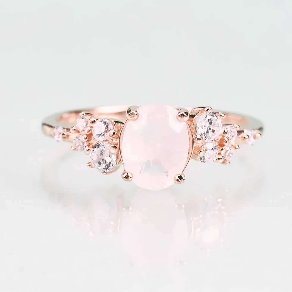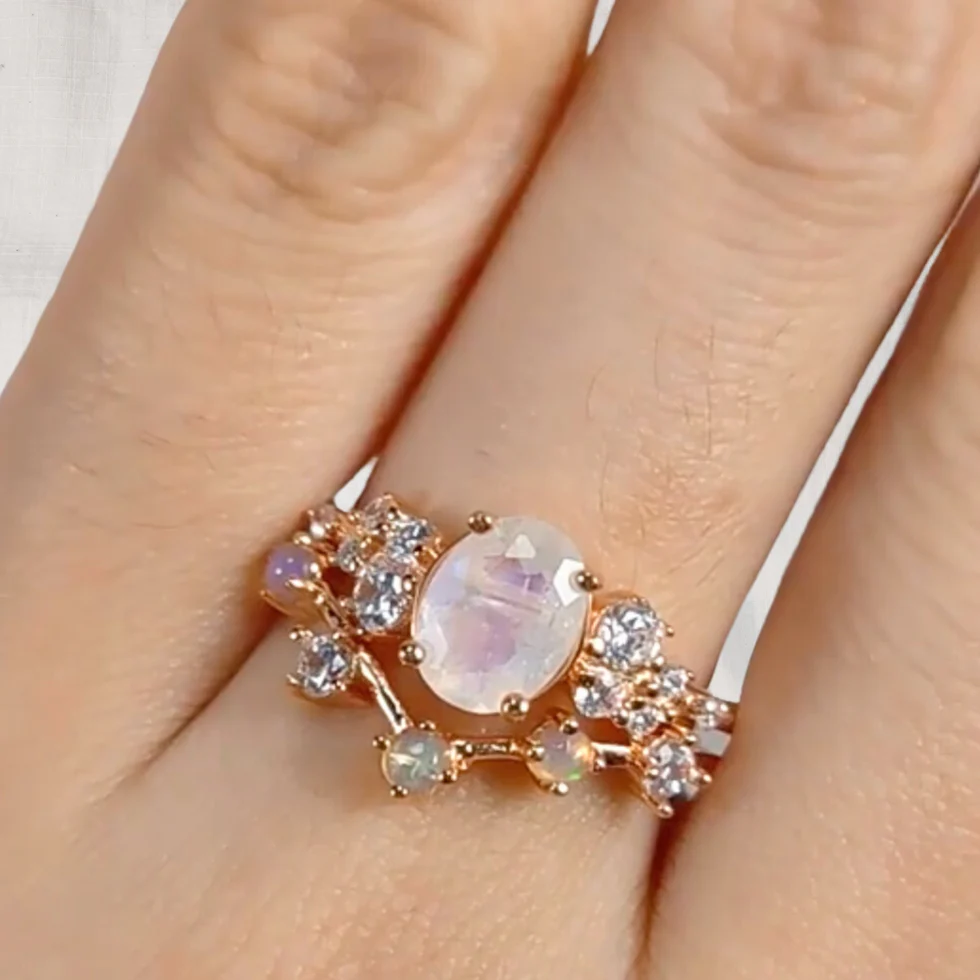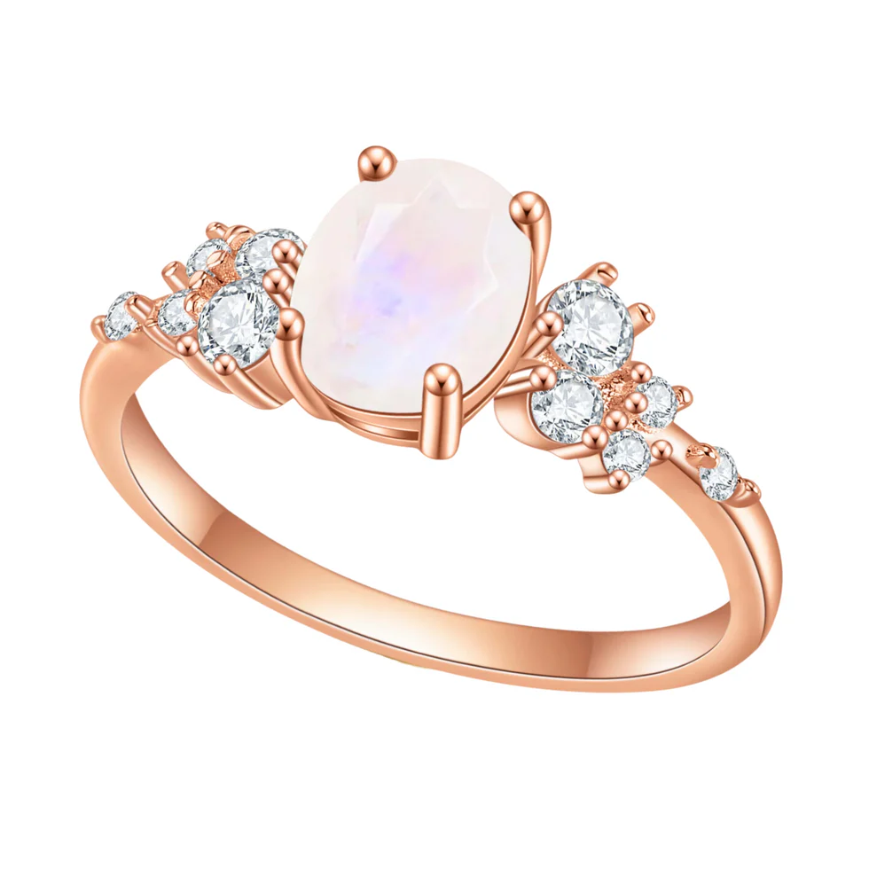 This beautiful Milky Rainbow Moonstone Cluster Ring is crafted with ethically-sourced moonstone from India and 925 sterling silver with 18K rose gold for a beautiful finish. Show off your style and make a statement with this unique piece.