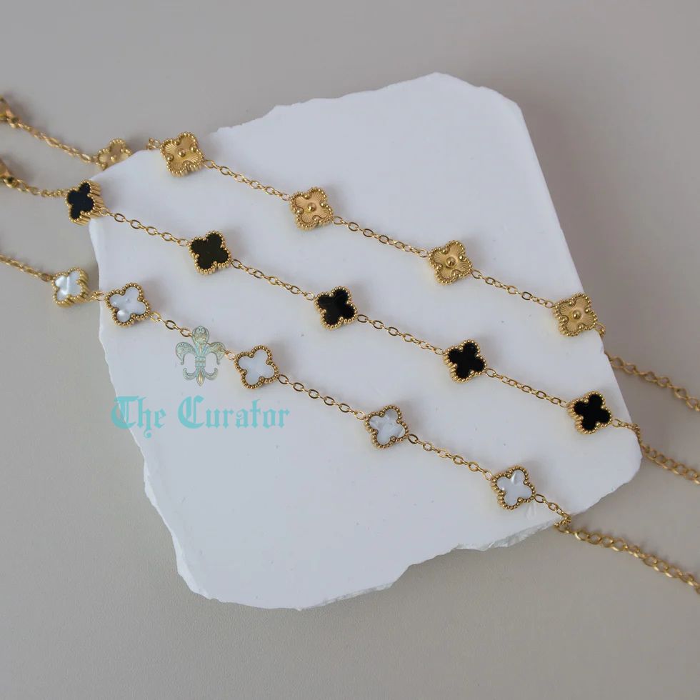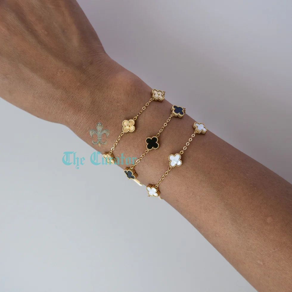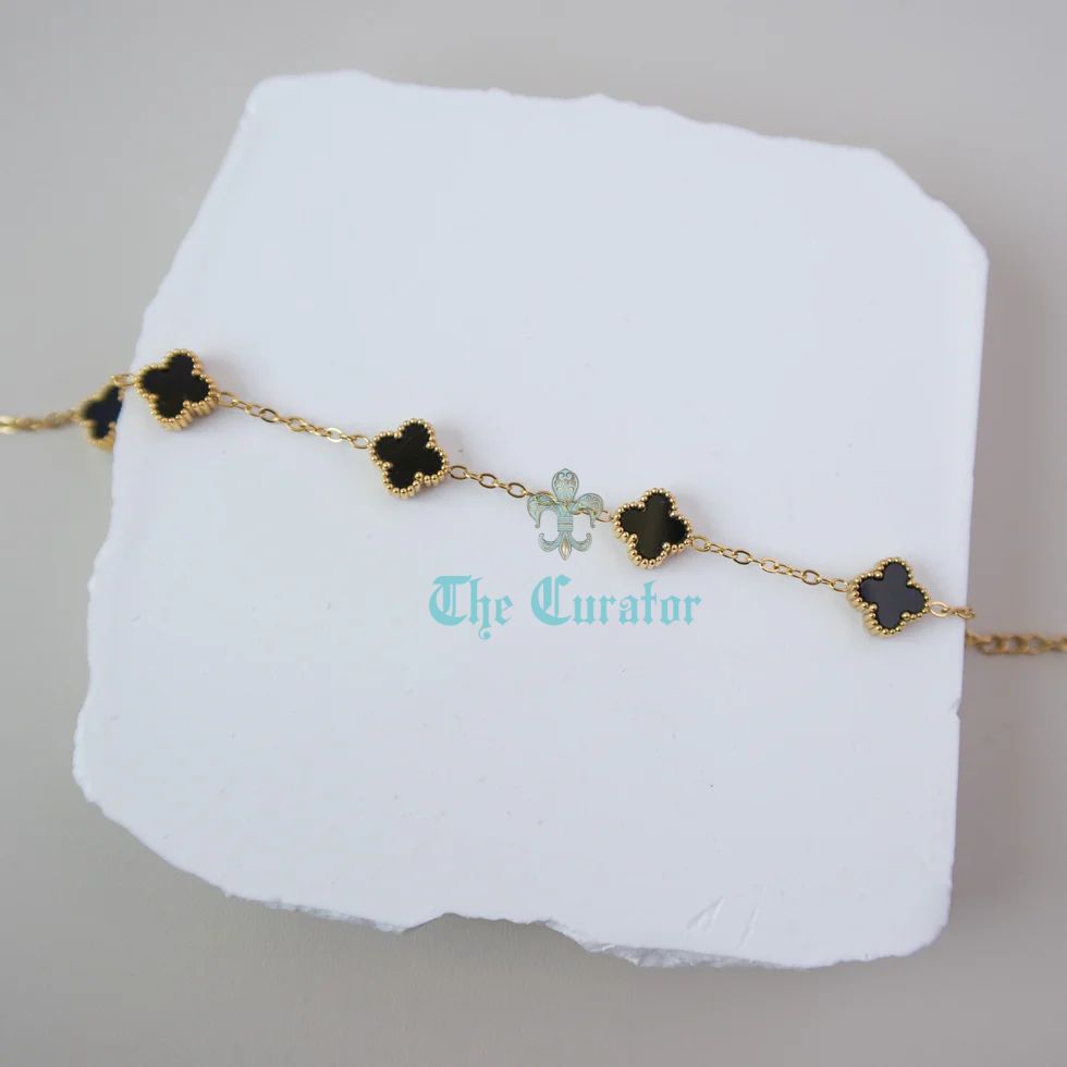 This designer inspired bracelet features a stunning black lucky four leaf clover design. Made with black enamel and 18K gold, this piece is not only stylish but also believed to bring good fortune to its wearer.
