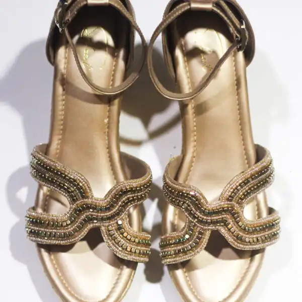 The standout feature of these wedges lies in their stunning adornments, meticulously positioned to capture and reflect light, resulting in a captivating shimmer. Donning these golden wedges ensures you leave a lasting impact at any noteworthy event.