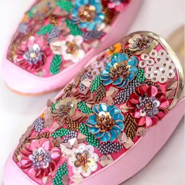 Pink Posey’s stunning mules, adorned with intricate embroidery, draw inspiration from Vincent Van Gogh’s “Irises” painting, infused with an extra pop of color. The vibrant yet soft pastel hues, embellished with glass tubes, sequins, and beadwork, make these mules a bold fashion statement, guaranteed to catch the eye of any fashion enthusiast looking to make an impression.