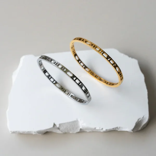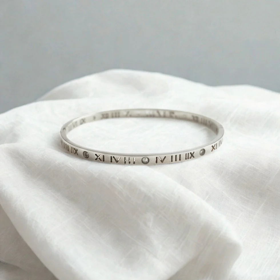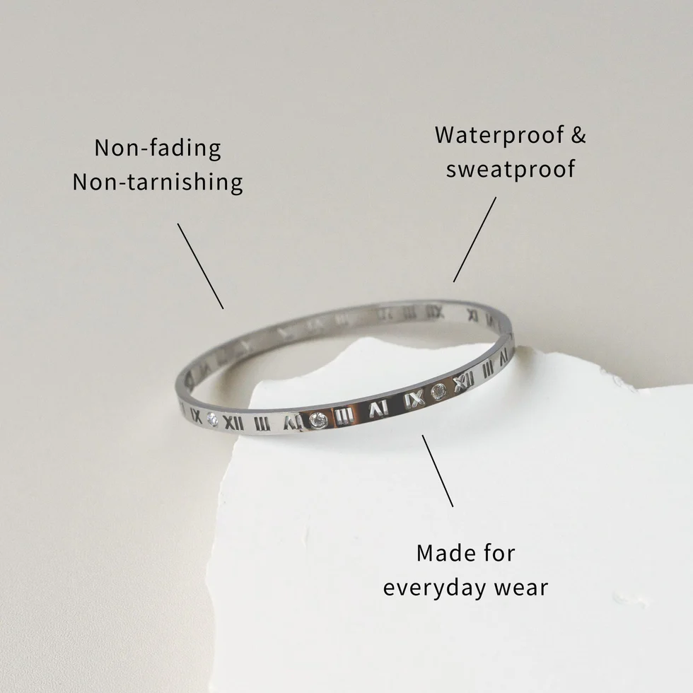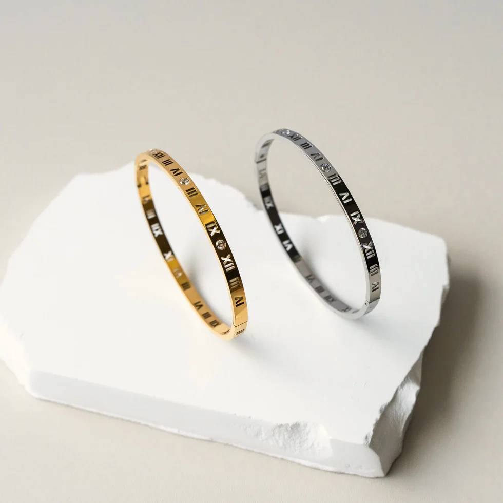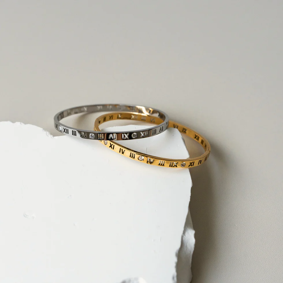 Introducing the VALERIA CZ Roman Numeral Bangle. Made with premium 316L stainless steel, this sophisticated bangle showcases intricate roman numerals, elevating any ensemble.